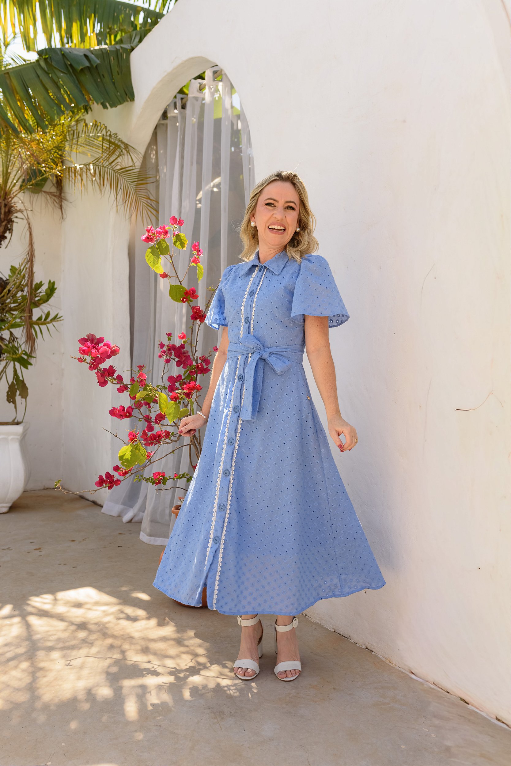 Comprimento maxi midi, confeccionado em uma delicada laise de algodão, que une frescor e charme.